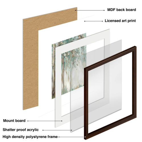 Note: Acrylic cover, mount board and back board used only for framed paper art prints and not canvas art prints.